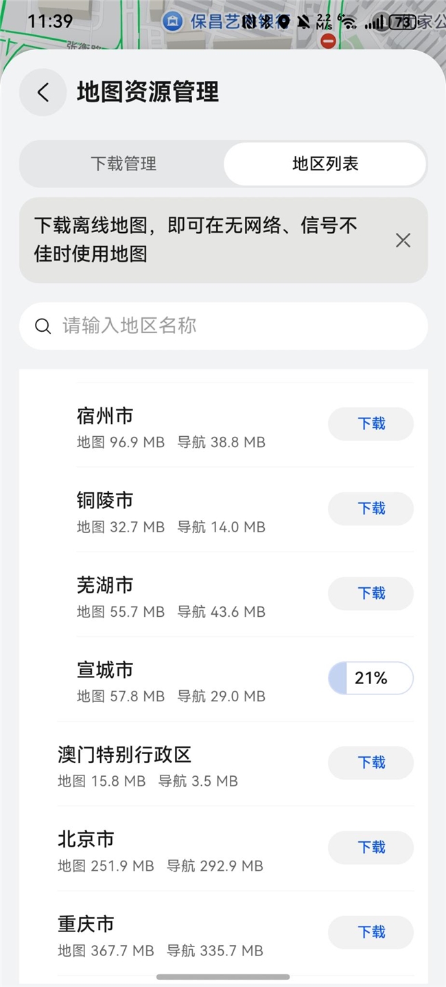 离线地图包里可以按省份城市选择,单独下载,这对于手机存储空间有限的用户来说非常友好。为了节省手机内存,我选择了安徽省宣城市的地图包,大小总共才约90MB,下载完地图包后同步也下载了离线语音导航包,这样,即使没网没信号也能跟着导航走了。最后我发现设置中还有一个很贴心的选项:“通过WLAN自动更新离线数据”,这意味着以后只要连接到WiFi,地图就会自动更新到最新版本,再也不用手动检查更新了。