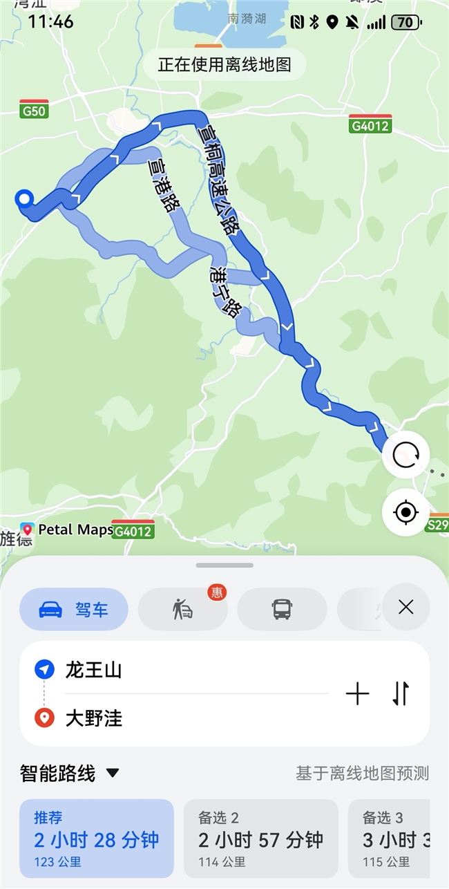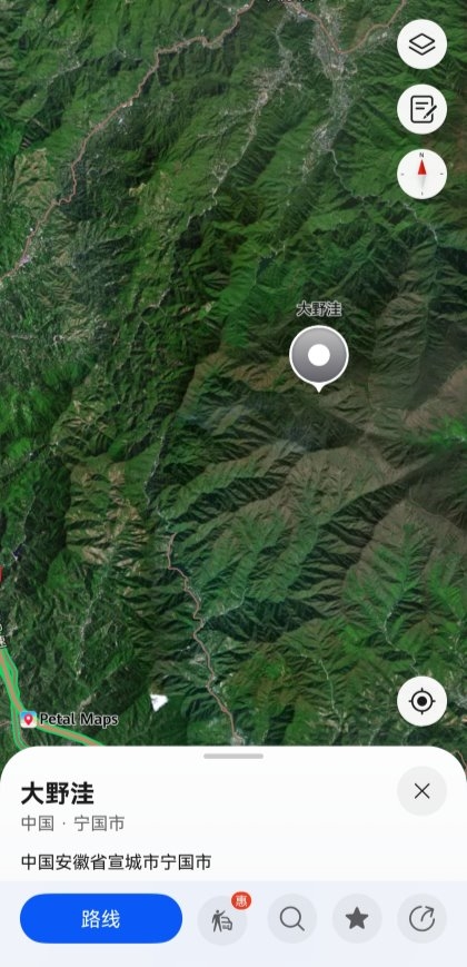 徒步当天车刚进宁国大野洼,手机信号就从 2 格掉到 “无服务”。队友的网直接卡在 “加载中”,我点开花瓣地图的离线地图,蓝点一秒锁定位置,连我们停车的道路名称都标得清清楚楚。