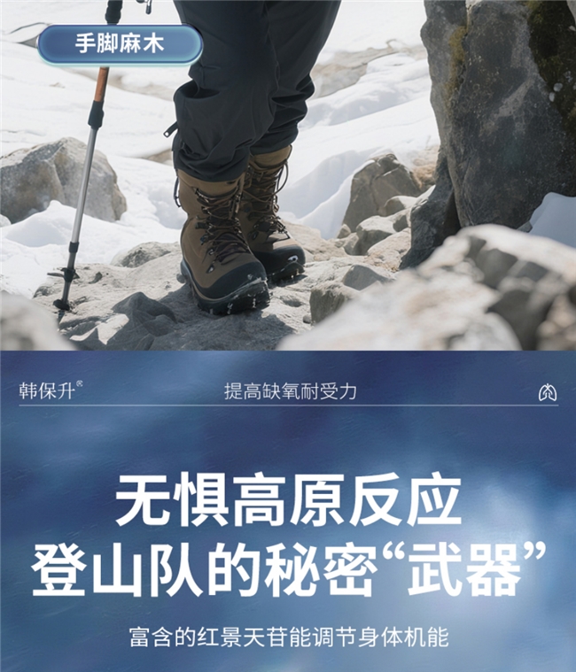 韩保升创新采用“红景天+角鲨烯”双形态组合设计,构建高原出行的全流程防护体系。红景天负责提前铺垫,帮助身体在出发前逐步适应低氧环境;角鲨烯负责即时适配,应对途中的突发低氧,无需额外携带笨重的应急物品。